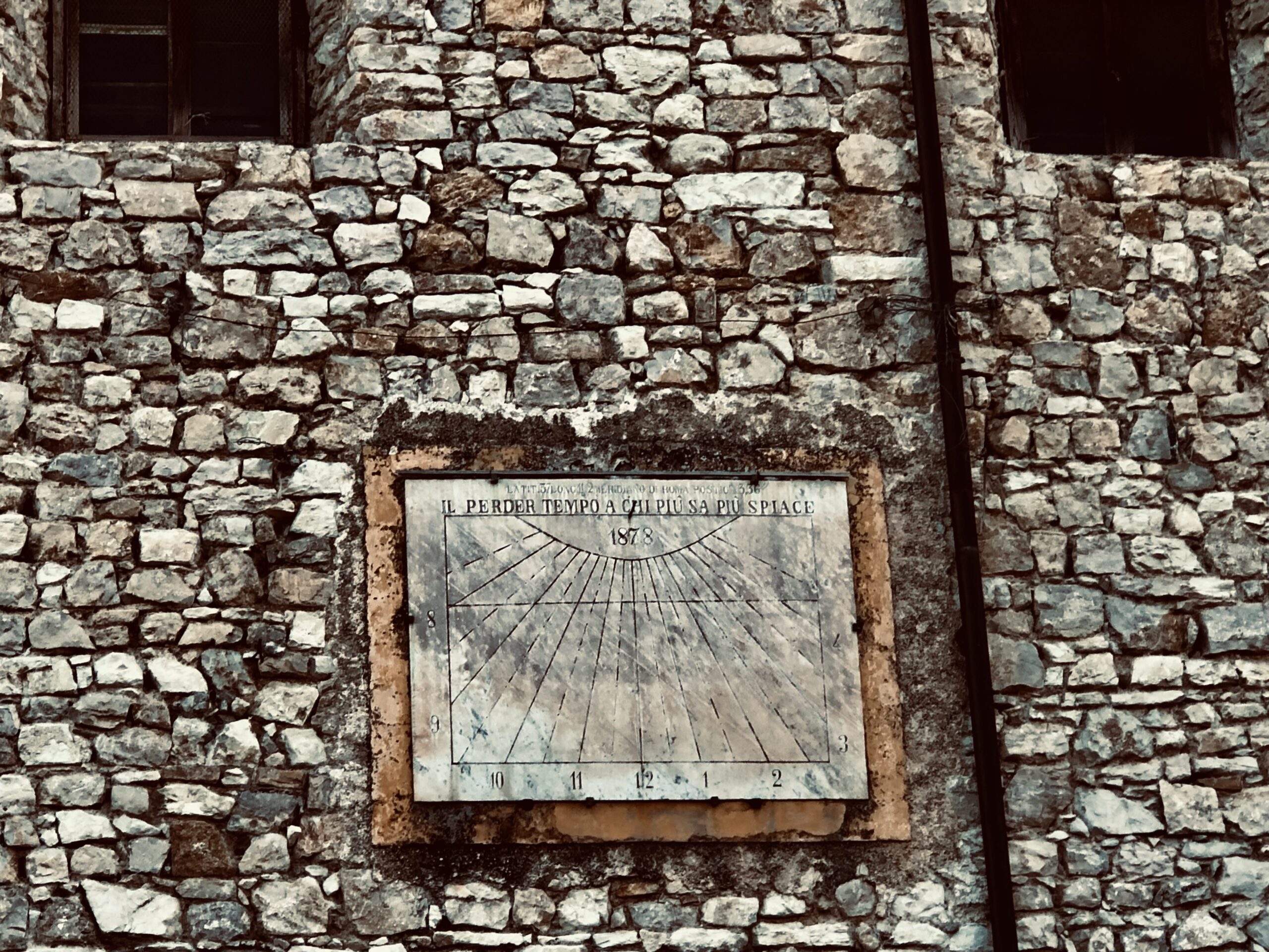 - Zegary słoneczne: Na bocznej fasadzie znajdują się dwa zegary słoneczne. Widoczny na zdjęciu ozdobiony jest sentencją „Il perder tempo a chi più sa più spiace”, przypominającą, że strata czasu najbardziej boli tych, którzy najlepiej rozumieją jego wartość.